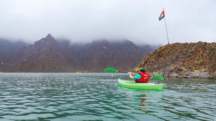 Glide across the emerald-green waters of Hatta Dam by kayak or pedal boat. Surrounded by dramatic rocky cliffs, it’s one of the UAE’s most picturesque paddle spots — perfect for photos, drone shots, and a peaceful escape into nature’s quiet.